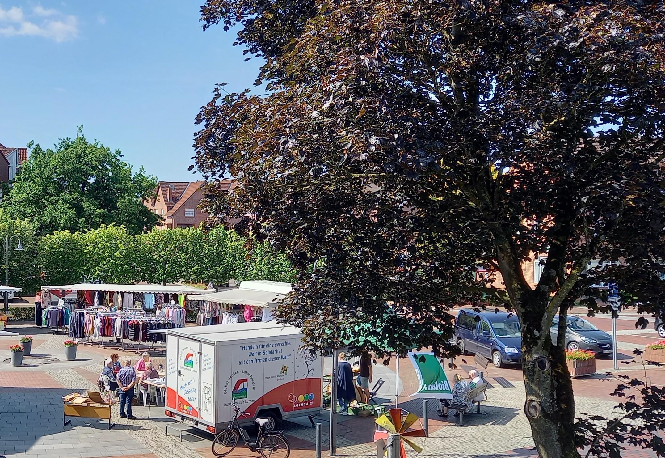 Der Wochenmarkt findet regelmäßig vormittags auf dem Erna-de-Vries-Platz statt. Besucherinnen und Besucher haben dort am