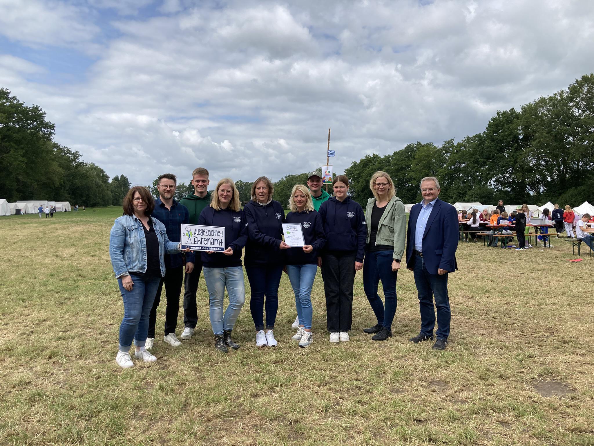 Das Küchenteam des jüngeren Zeltlagers Haselünne (vorne, 4. bis 7. v. l.) freut sich über die Wahl bei „Ausgezeichnet!Ehrenamt“. Sandra Rickermann (l.) vom Ehrenamtsservice und Timo Deiters (2. v. l.), Abteilungsleiter beim Landkreis Emsland, besuchten das Zeltlager.