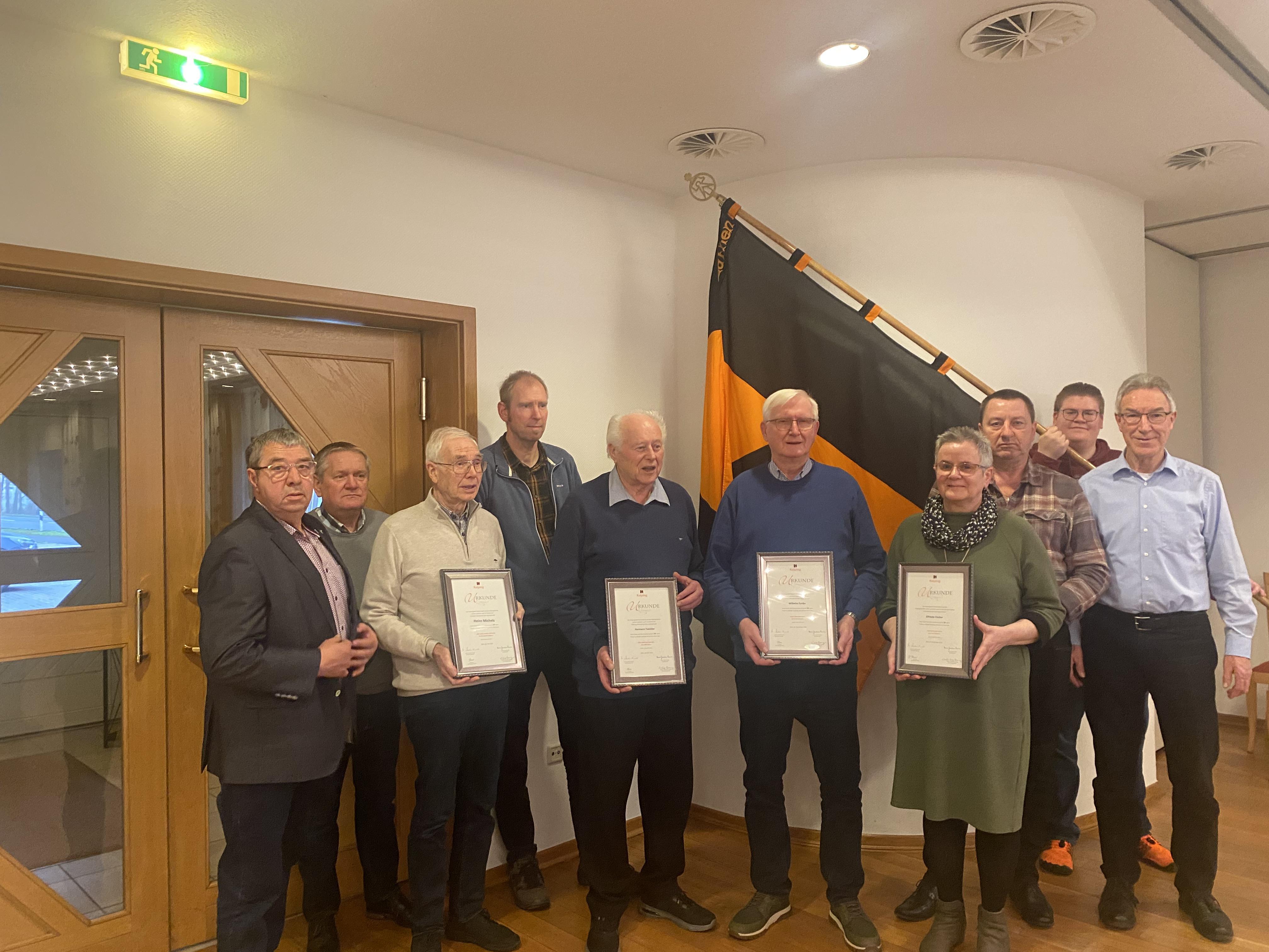 H. Twickler 65 Jahre, H. Konnemann 65 Jahre, (nicht anwesend), H. Knese 65 Jahre, (nicht anwesend), H. Michels 60 Jahre, W. Funke 50 Jahre, E. Fischer 50 Jahre.