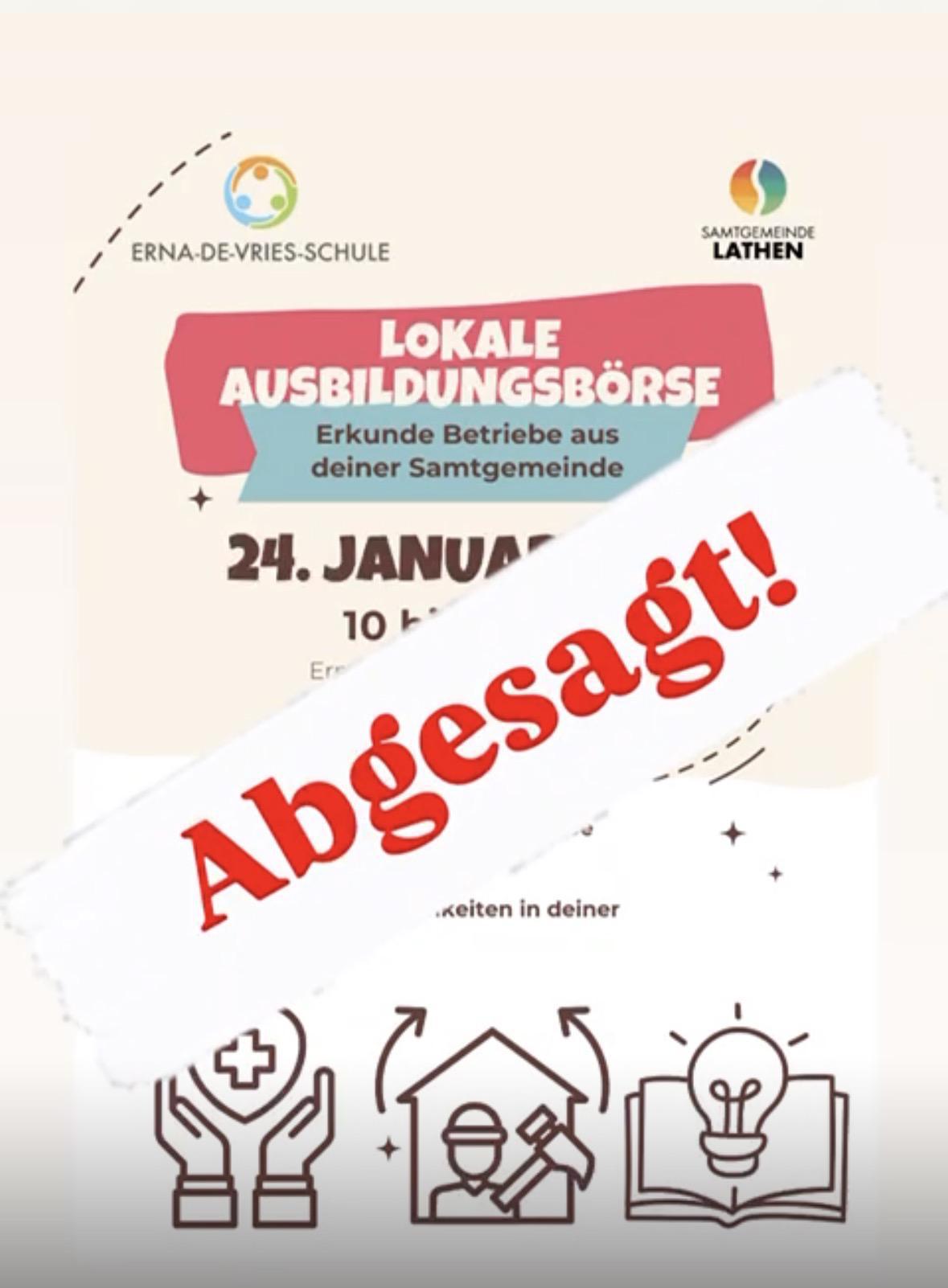 Aufgrund der Witterungsverhältnisse muss die für heute geplante Ausbildungsbörse abgesagt werden.