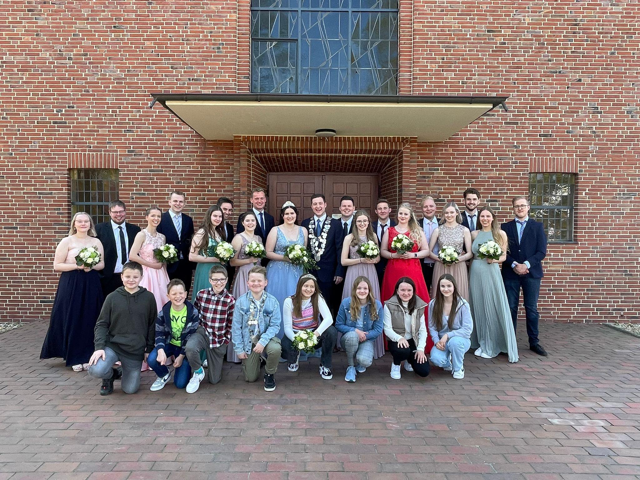 Lukas Thien hat die Königswürde in Neulangen erhalten. Auf dem Foto ist er zusammen mit seiner Königin Lisa Rosen samt dem Thronfolge.