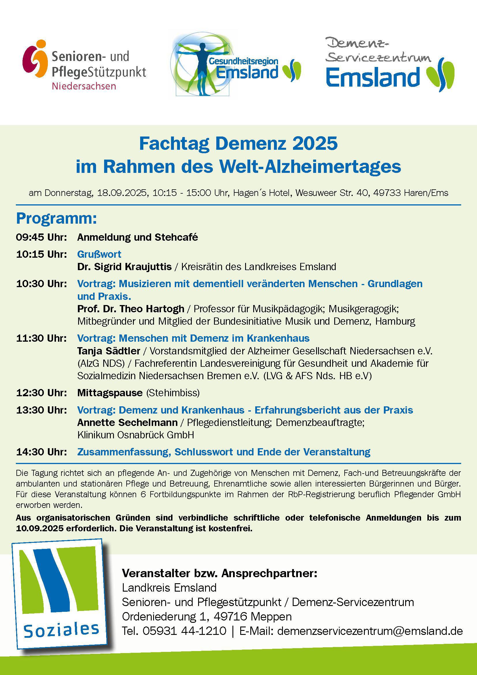Auf dem Programm stehen nach der Begrüßung durch Sozialdezernentin Dr. Sigrid Kraujuttis vom Landkreis Emsland die Vorträge „Musizieren mit dementiell veränderten Menschen – Grundlagen und Praxis“ von Prof. Dr. Theo Hartogh, Professor für Musikpädagogik, „Menschen mit Demenz im Krankenhaus“ von Tanja Sädtler, Vorstandsmitglied der Alzheimer Gesellschaft Niedersachsen, sowie „Demenz und Krankenhaus - Erfahrungsbericht aus der Praxis“ von Annette Sechelmann, Pflegedienstleitung und Demenzbeauftragte am Klinikum Osnabrück. Die Referenten stellen neue Ansätze im Umgang mit Demenz für die Praxis vor.