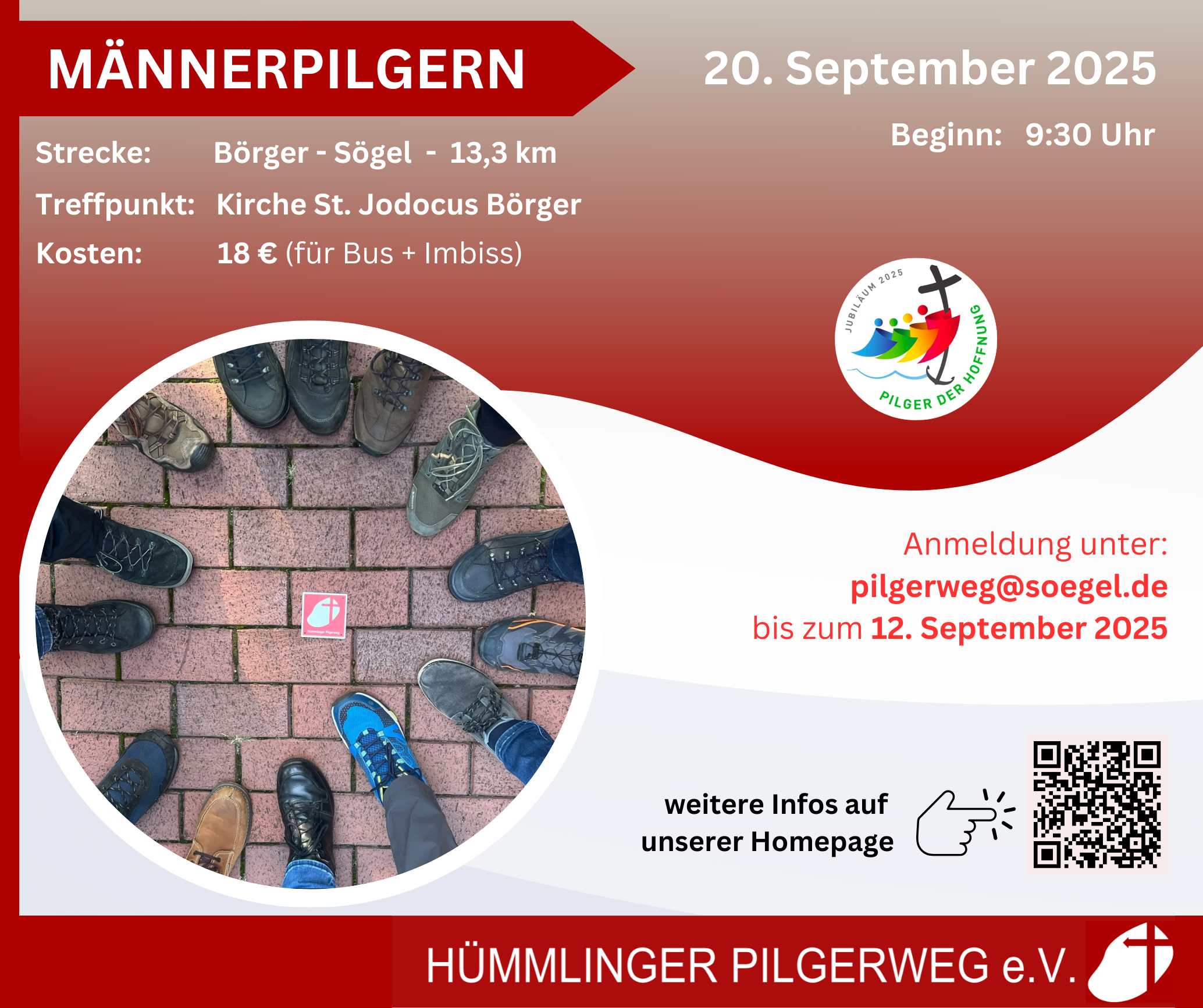 Der Hümmlinger Pilgerweg e.V. lädt alle Männer herzlich zum Männerpilgern ein! Am Samstag, den 20. September, startet die gemeinsame Wanderung um 09:30 Uhr. Die Veranstaltung bietet die Gelegenheit, Körper und Seele in Gemeinschaft zu stärken, neue Kraft zu schöpfen und den Pilgerweg zwischen Börger und Sögel zu erleben.