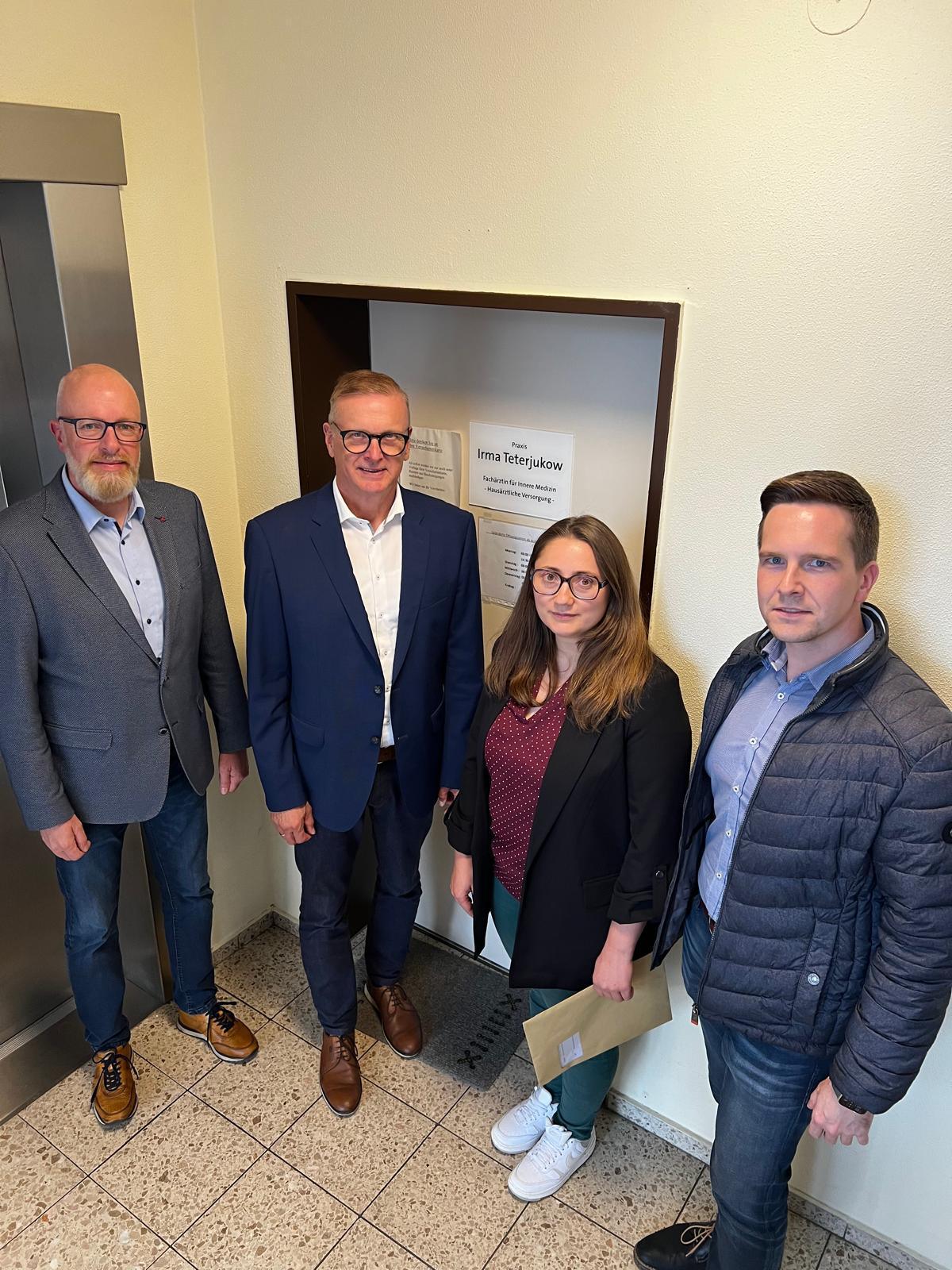 Bürgermeister Norbert Holtermann (lk.), Gemeindedirektor und Samtgemeindebürgermeister Helmut Wilkens (zweiter von lk.) sowie Michael Kirchner (re.) begrüßen die zukünftige Hausärztin Diana Laptedulce, die ab 2026 die Praxis von Irma Teterjukow in Lathen übernimmt.