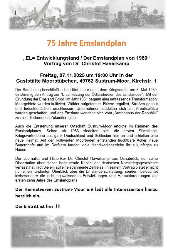 Der Journalist und Historiker Dr. Christof Haverkamp aus Osnabrück, der seine Dissertation über dieses bedeutende Kapitel der deutschen Nachkriegsgeschichte verfasst hat, lädt Sie ein auf eine spannende Zeitreise. In seinem Vortrag bietet er nicht nur einen fundierten Überblick über die Emslanderschließung, sondern beleuchtet insbesondere die richtungsweisenden Entwicklungen und Herausforderungen der ersten zehn Jahre des Emslandplans