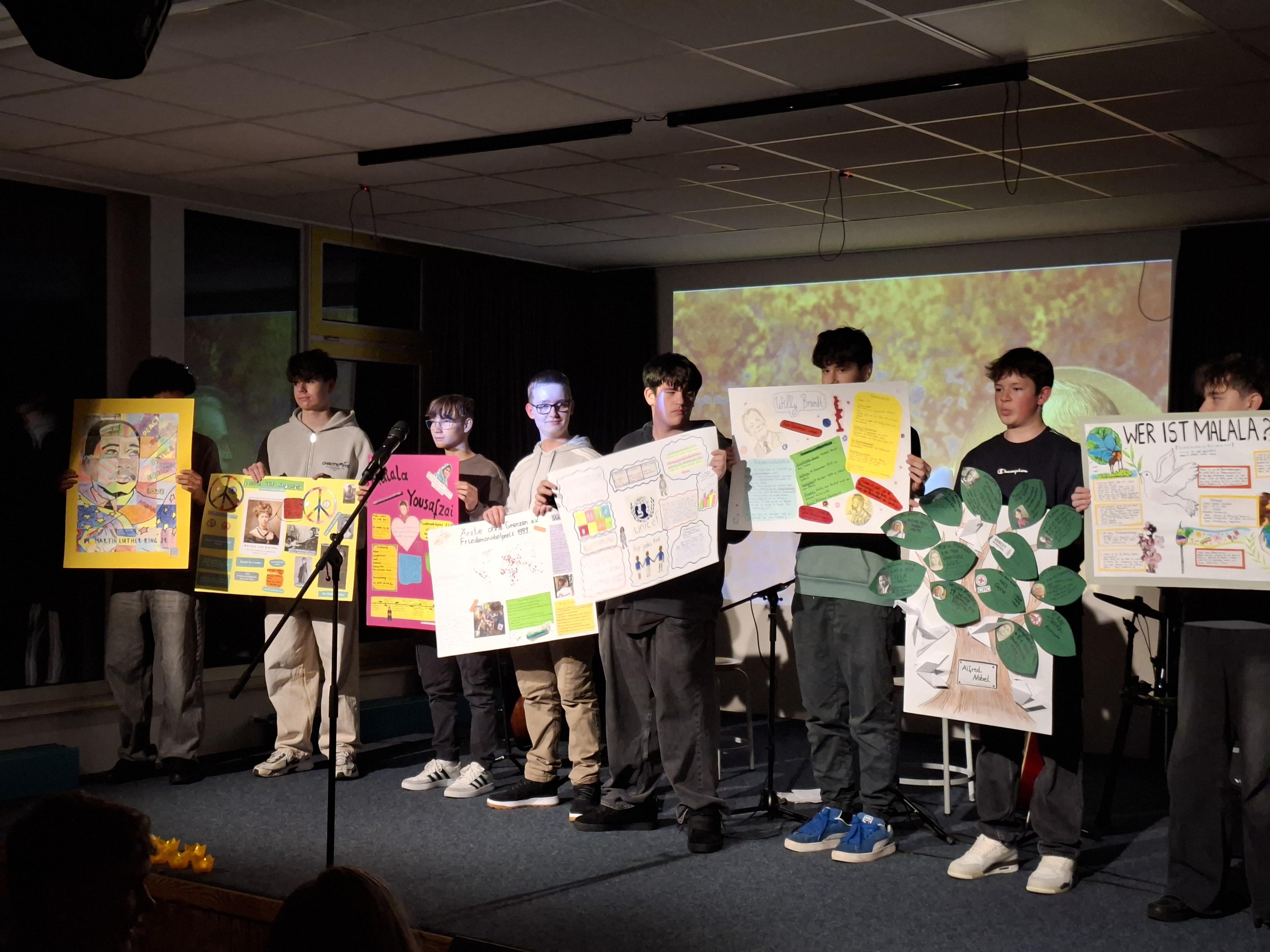 Am Abend wurden die Ergebnisse in einer feierlichen Präsentation der Öffentlichkeit vorgestellt. Eltern, Lehrkräfte und Gäste konnten die vielfältigen Arbeiten bestaunen und kamen dabei mit den Schülerinnen und Schülern ins Gespräch. Ein besonderer Höhepunkt war die Auszeichnung der besten Plakate jedes Jahrgangs. Diese werden für ein Jahr in einer Ausstellung auf dem Schulhof gezeigt – als sichtbares Zeichen für Frieden, Mut und Hoffnung.