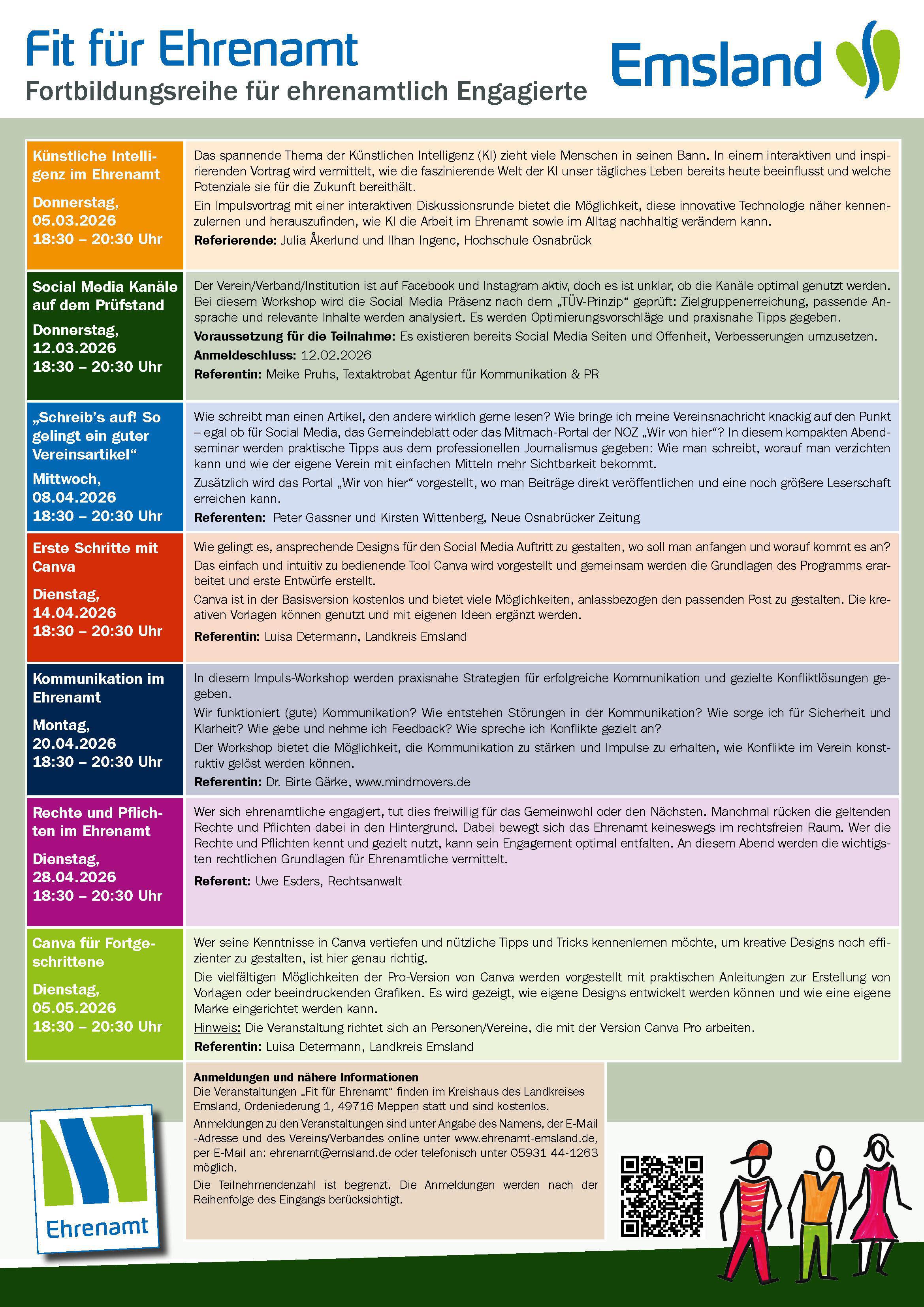 Ein seit Jahren bewährtes Mittel zur Unterstützung und Qualifizierung des Ehrenamtes ist die Fortbildungsreihe „Fit für Ehrenamt“, die sich speziell an die Aktiven in den zahlreichen Vereinen, Verbänden und Organisationen richtet. Von März bis Mai 2026 finden wieder einige Veranstaltungen in der Reihe zu unterschiedlichen Themen mit fachkundigen Referentinnen und Referenten im Kreishaus Meppen statt.