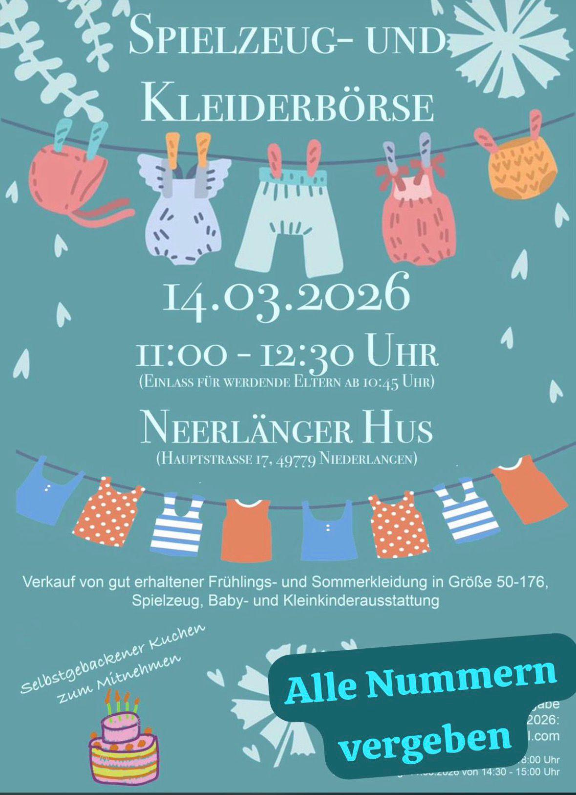 Am 14.03.2026 von 11.00 Uhr bis 12.30 Uhr findet im Neerlänger Hus der Verkauf von gut erhaltener Frühlings- und Sommerkleidung in den Größen 50 bis 176, sowie Spielzeug, Baby- und Kleinkinderausstattung statt. Der Einlass für werdende Eltern ist bereits für 10.45 Uhr vorgesehen.