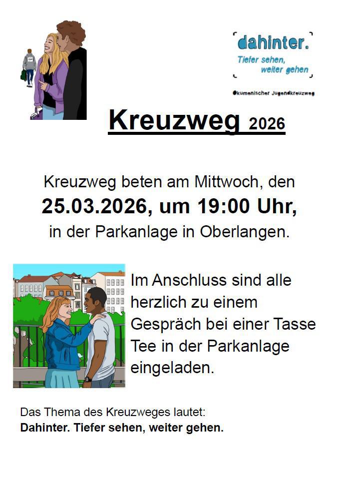 Herzliche Einladung zum Kreuzweg beten am 25.03.2026 um 19.00 Uhr in der Parkanlage in Oberlangen mit anschließendem Gespräch bei einer Tasse Tee.