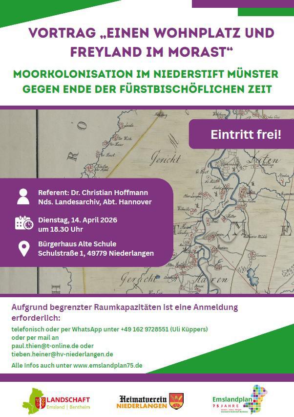 „Im 18. Jahrhundert stellte die Bevölkerungszahl eines Territorialstaats bzw. deren Steigerung einen wesentlichen Machtfaktor dar. Bevölkerungswachstum, u. a. durch Ansiedlung von Zuwanderern erzeugt, steigerte die Produktivität und damit auch die landesherrlichen Steuereinnahmen. Auch im Interesse der Landesverteidigung war eine Steigerung der Einwohnerzahlen erwünscht. Die Landesherrschaften suchten durch Urbarmachung von Brachland Siedlerstellen zu schaffen, nicht um Abwanderungswillige im Land zu halten, sondern vielmehr Neusiedler anzulocken. Im Hochstift Münster kamen hier vorrangig die ausgedehnten Moorgebiete des Niederstifts für solche Ansiedlungen in Frage. Rechts und links der Ems wurden im Jahr 1788 von den landesherrlichen Beamten 14 neue Kolonien angelegt. Die Neubauern hatten allerdings nicht nur mit dem Moor, sondern – wie der Vortrag zeigen wird – mit großem Widerstand aus den alten Dörfern zu kämpfen“.