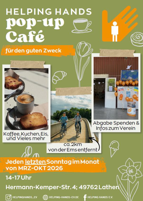 Der Verein Helping Hands e. V. aus Lathen startet in diesem Jahr ein neues Angebot: Von März bis Oktober lädt der Verein jeweils am letzten Sonntag im Monat zu einem pop-up Café ein. In der Zeit von 14 bis 17 Uhr sind Radfahrer, Spaziergänger und alle Interessierten herzlich willkommen.