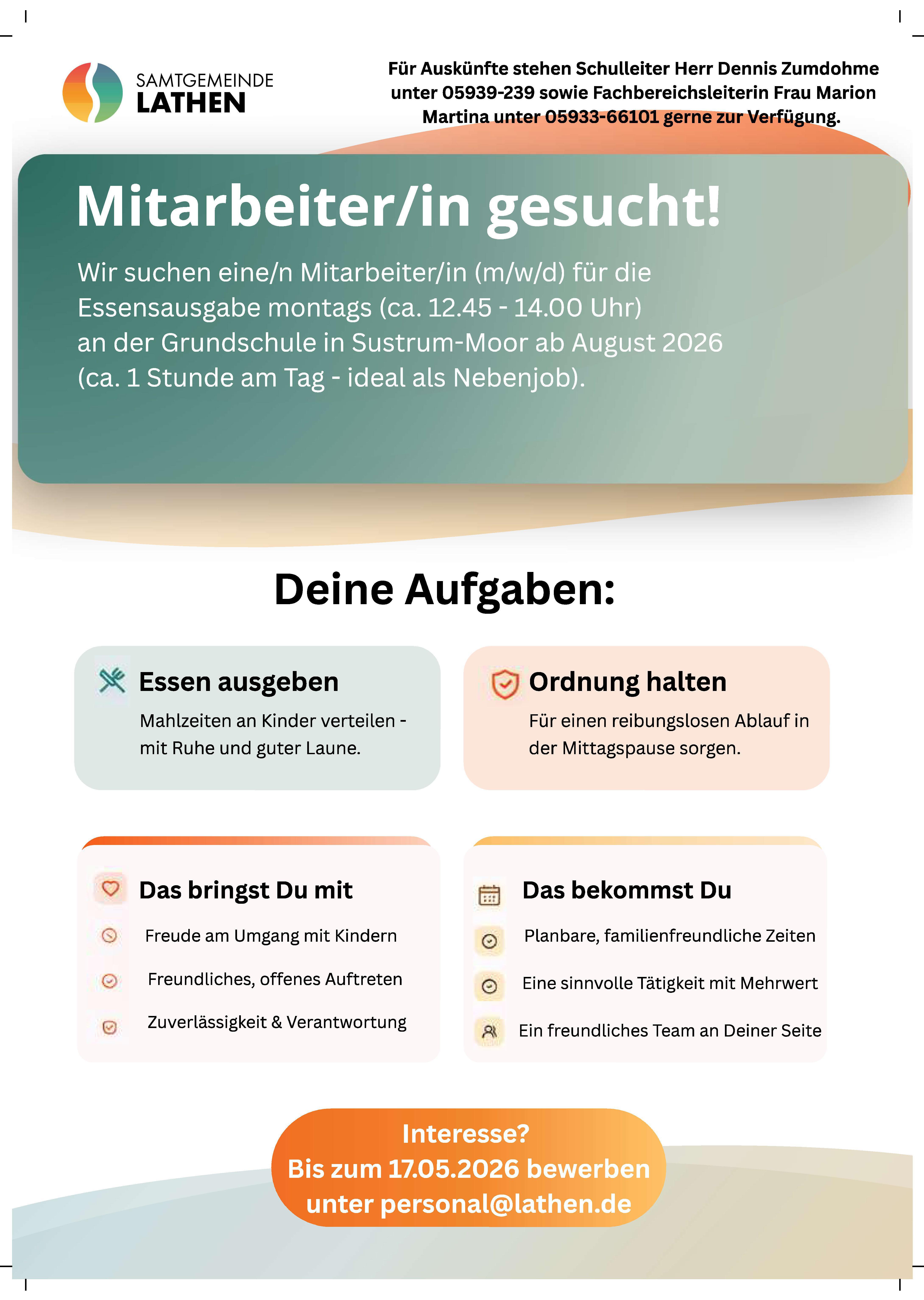 Mitarbeiter für die Grundschule in Sustrum-Moor gesucht!